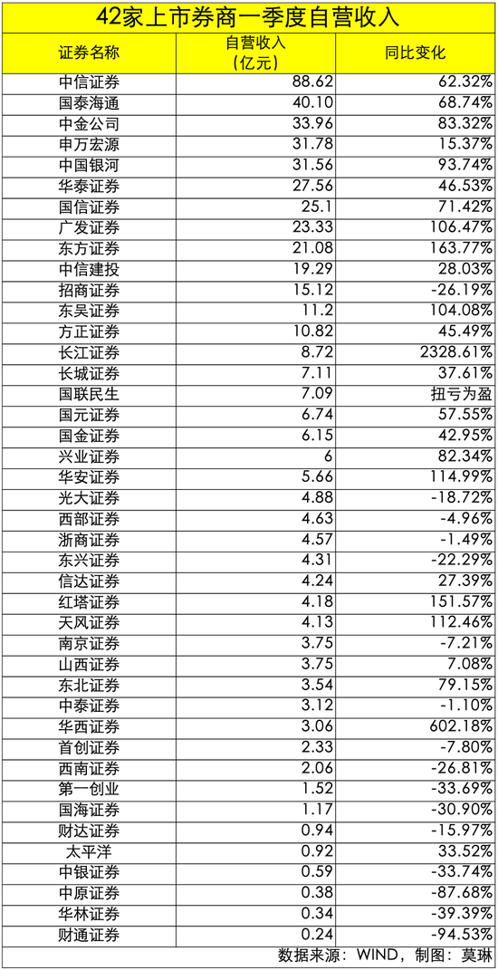 今年一季度,自营业务是证券公司业绩分化的关键因素。例如东北证券、长江证券、华西证券、东吴证券等归母净利润翻倍增长的券商,主要因自营业务大幅增长;而财通证券、中原证券、第一创业等券商的业绩减少则受自营业务收入下滑拖累。