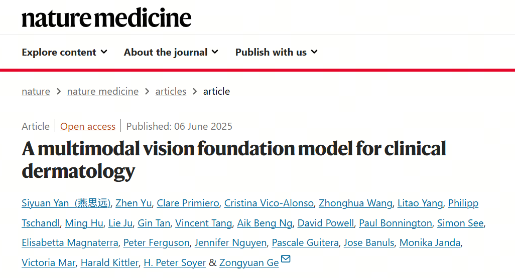 近日,由鹰瞳Airdoc-莫纳什联合实验室的研究人员深度参与的一个国际研究团队,开发了一种新的人工智能(AI)驱动的算法工具PanDerm,可以同时分析多种成像类型,从而更快、更准确地检测黑色素瘤和一系列其他皮肤病。该研究成果已正式发表在国际顶级医学期刊《Nature Medicine》。